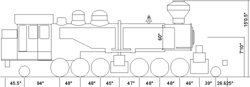 Engine Truck WheelsDiameter, front: 24" Journals: 4.5" x 7.5" Diameter, back: 26" Journals: 5" x 8" Wheel BaseDriving: 23' 8" Rigid: 8' 0" Total Engine: 37' 9" WeightOn Driving Wheels: 177,200 lbs. On Truck, front: 13,950 lbs. On Truck, back: 14,800 lbs. Total Engine: 205,950 lbs. Tank CapacityWater, 2,000 gals. Wood, 4 tons. Later Oil, 1,000 gals.